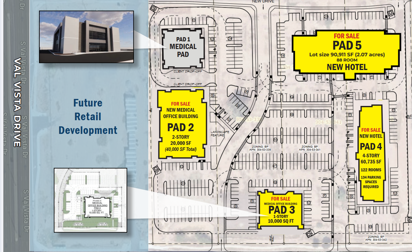 In addition to medical office suites, PADs will be available for sale, giving healthcare providers and investors the flexibility to build custom-built spaces tailored to their needs. This is also a mixed use development with two (2) Hotel PADS also available for sale.